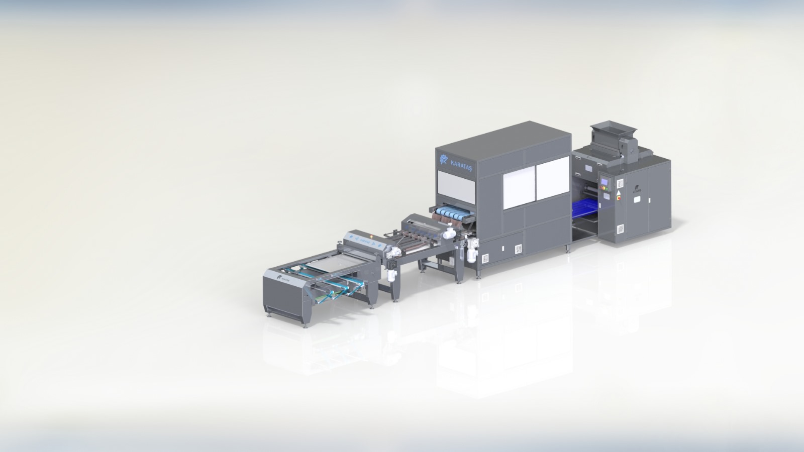 Üretilen hamurlar, otomatik olarak tavaya serilir.